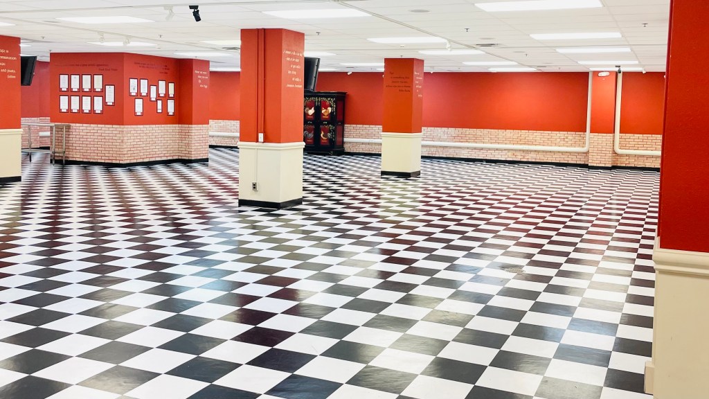 After the movie, we continued throughout the bunker, stopping in rooms that had been maintained since their construction back in the late 50s. We passed through the decontamination chambers where the occupants would have done the same when they first arrived. Then we were brought down a flight of cement stairs into what appeared to be a dark basement where our guide beckoned us to gaze upon a massive round furnace. And while it wasn’t used to heat the bunker, the guide explained, it would have been used to dispose of any waste that was accumulated if the bunker was put into use. Oh, and that’s where they would have gotten rid of the bodies of anyone who died in the bunker; grim. After about 90 minutes of poking in and out of rooms and listening to our guide explain the significance of each one, we entered the final room of the tour. The dining hall. It wasn’t nearly as big as I expected, either. More interestingly, though, the floor was made up of a tiled pattern like a tight checkerboard laid out across the room. I noticed that everyone in the group seemed antsier than before, and I felt a little uncomfortable myself. I assumed it was because of the long tour and too much information. Maybe I was getting bored, even though it felt different than that.